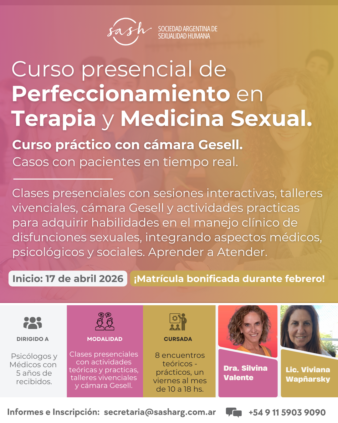 01/Abr/2026¡Inscripciones abiertas y matrícula bonificada durante todo febrero! Para poder iniciar el proceso de inscripción del curso, se requiere entrevista previa, razón por la cual le solicitamos por favor nos envíe un correo a secretaria@sasharg.com.ar Desestimar el cartel que a continuación indica que el proceso de inscripción está finalizado. Como mencionamos anteriormente, la entrevista de admisión previa al pago, es requerida. Envianos un mail a secretaria@sasharg.com.ar y te indicaremos cuáles son los pasos a seguir para poder inscribirte.