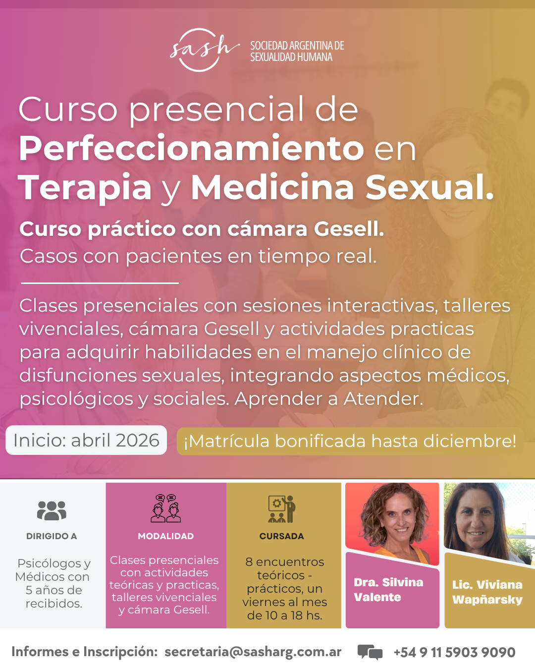 ¡Inscripciones abiertas y matrícula bonificada hasta diciembre! Para poder iniciar el proceso de inscripción del curso, se requiere entrevista previa, razón por la cual le solicitamos por favor nos envíe un correo a secretaria@sasharg.com.ar