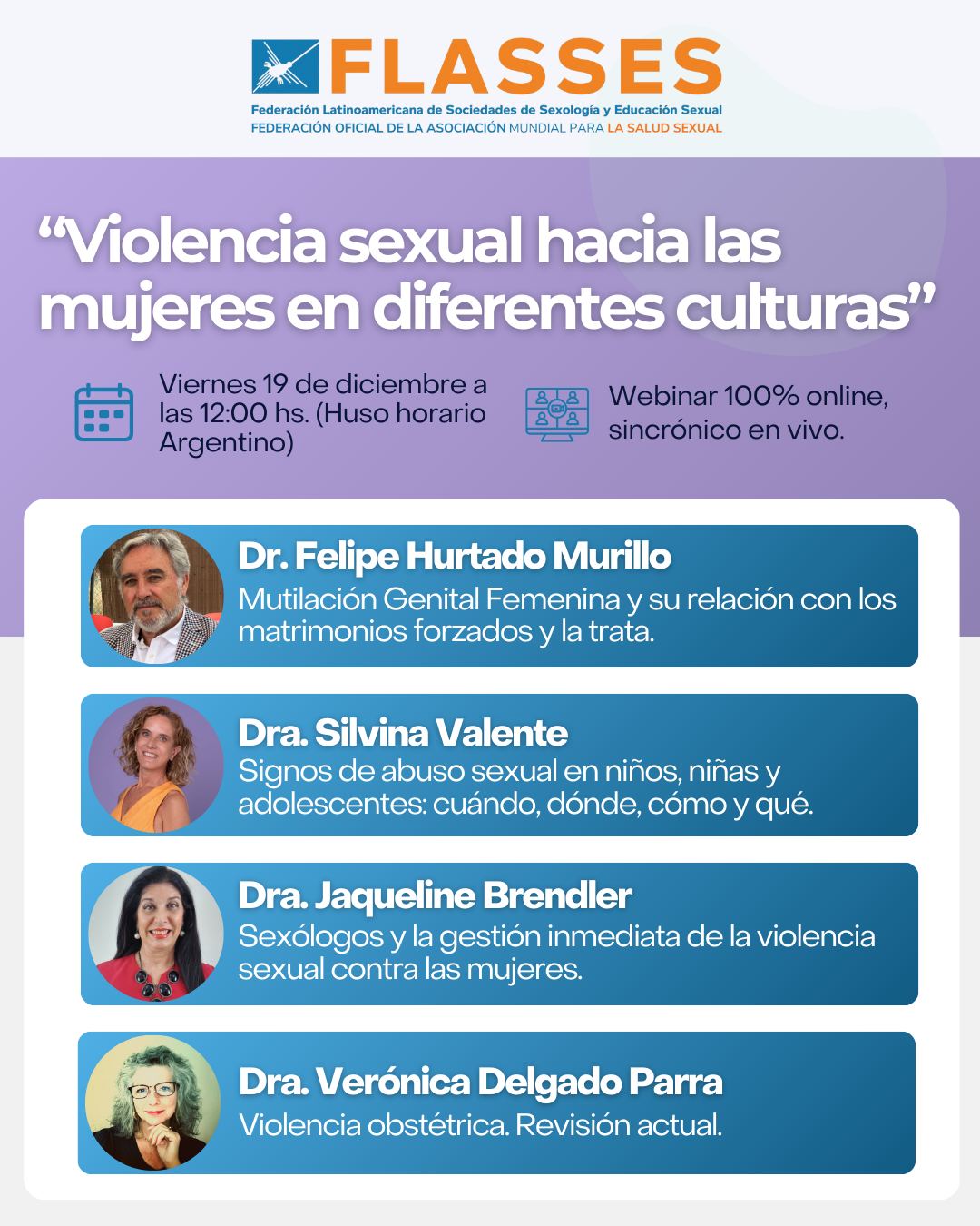 Les acercamos la grabación del Webinar de FLASSES que fue brindado el 19 de diciembre de 2025. En el mismo, participaron el Dr. felipe Hurtado Murillo (España), la Dra. Jaqueline Brendler (Brasil), la Dra. Silvina Valente (Argentina) y la Dra. Verónica Delgado Parra (México).